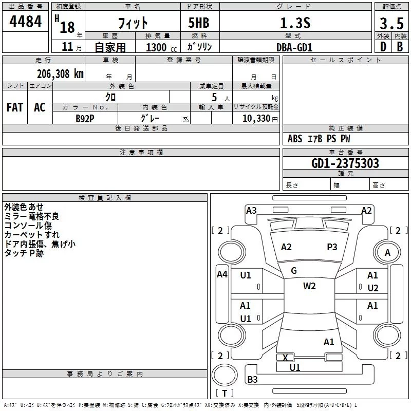 1.3S | DBA-GD1 | L13A | FF | CVT | 1339cc | 86ps(63kW)/5700rpm | AИ-92 | 1 417 500 | |