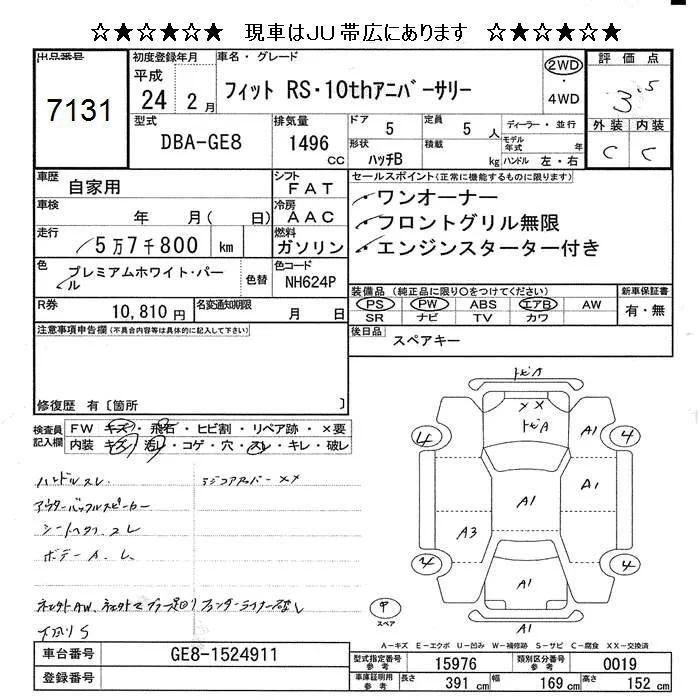 RS | DBA-GE8 | L15A | FF | 6MT | 1496cc | 120ps(88kW)/6600rpm | AИ-92 | 1 740 000 | |