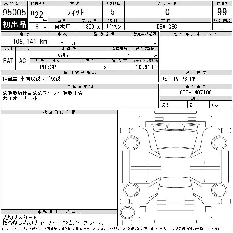 G | DBA-GE6 | L13A | FF | 5MT | 1339cc | 100ps(73kW)/6000rpm | AИ-92 | 1 230 000 | |