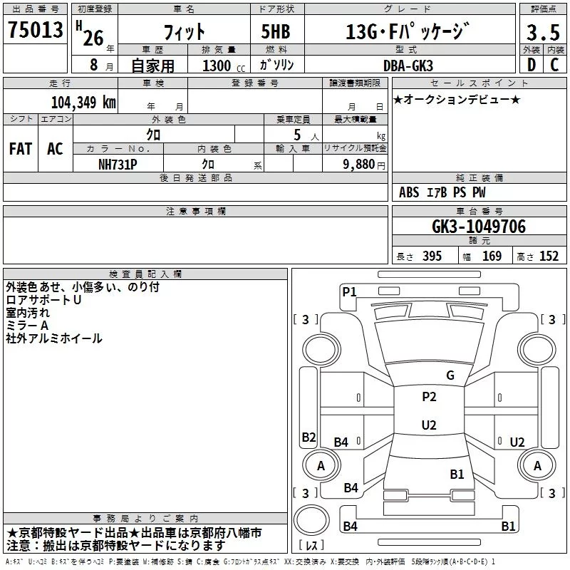 13G S PACKAGE | DBA-GK3 | L13B | FF | CVT | 1317cc | 100ps(73kW)/6000rpm | AИ-92 | 1 604 572 | |