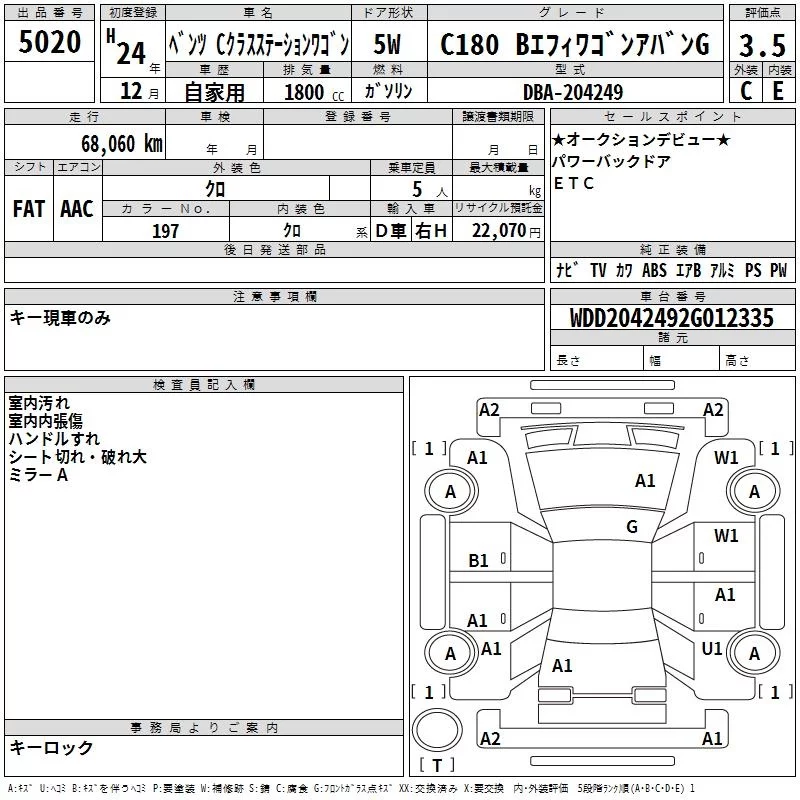 • Комплектация: C180 Bエフィ Wagon ア Van G