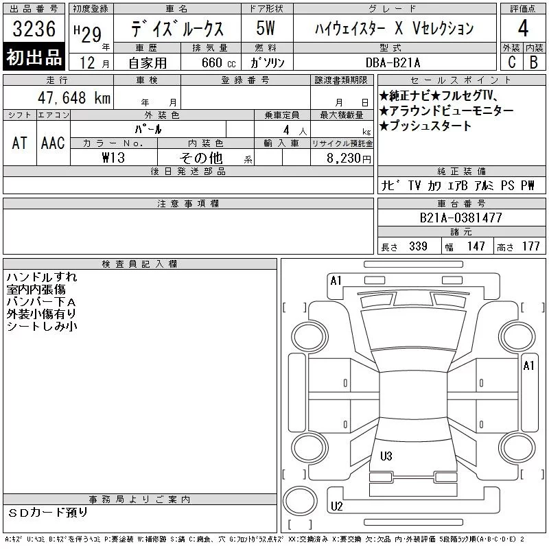 X V SELECTION | DBA-B21A | 3B20 | FF | CVT | 659cc | 49ps(36kW)/6500rpm | AИ-92 | 1 490 400 |