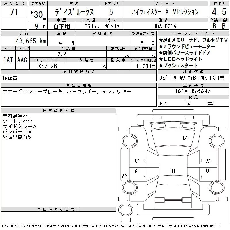 HIGHWAY STAR X V SELECTION | DBA-B21A | 3B20 | Full-time 4WD | CVT | 659cc | 49ps(36kW)/6500rpm | AИ-92 | 1 825 200 | |