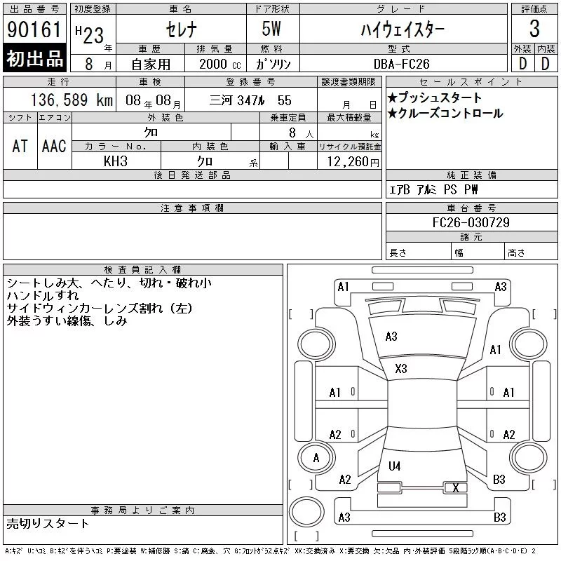 HIGHWAY STAR V AERO SELECTION | DBA-FC26 | MR20DD | FF | CVT | 1997cc | 147ps(108kW)/5600rpm | AИ-92 | 2 795 100 |