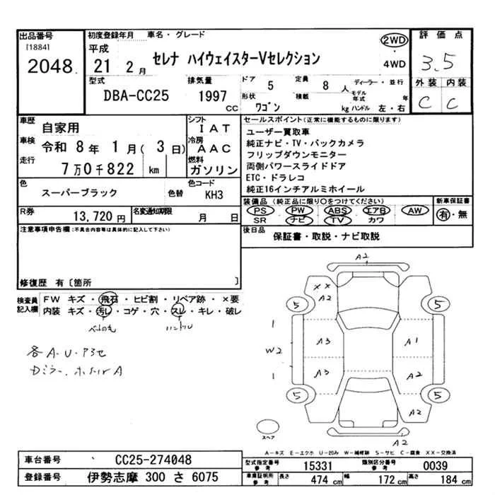HIGHWAY STAR V AERO SELECTION BLACK LEATHER NAVI PACKAGE | DBA-CC25 | MR20DE | FF | CVT | 1997cc | 137ps(101kW)/5200rpm | AИ-92 | 3 139 500 | |