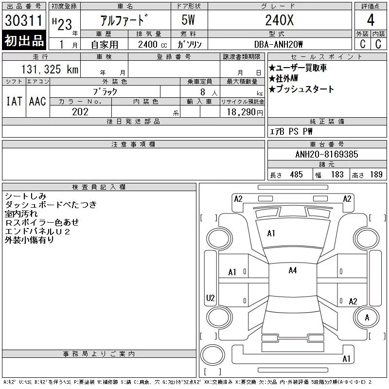 240X | DBA-ANH20W | 2AZ-FE | FF | CVT | 2362cc | 170ps(125kW)/6000rpm | AИ-92 | 3 175 000 | |
