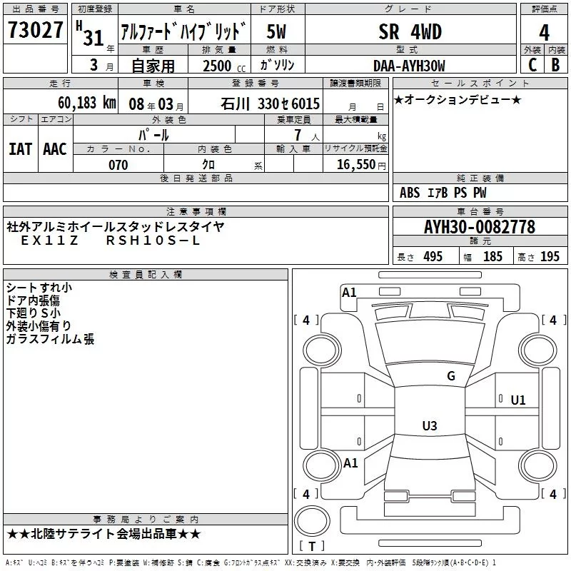 2.5S A PACKAGE | DBA-AGH35W | 2AR-FE | Full-time 4WD | CVT | 2493cc | 182ps(134kW)/6000rpm | AИ-92 | 4 253 700 | |