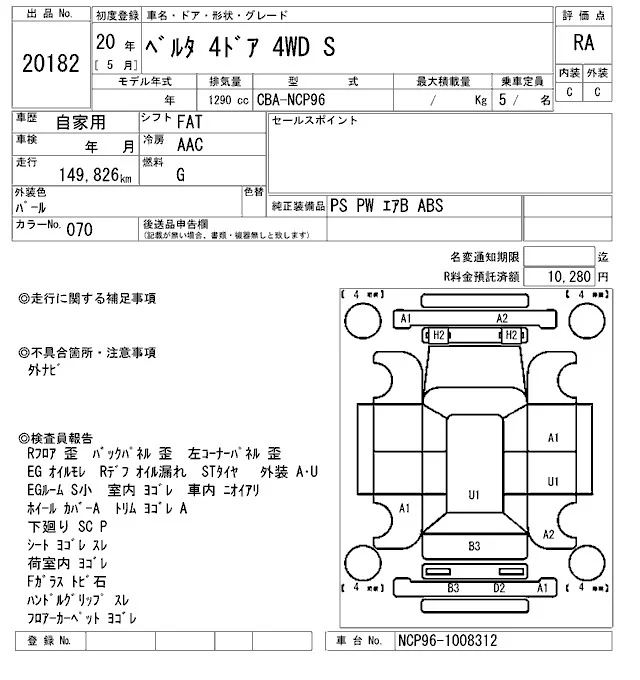 X | CBA-NCP96 | 2NZ-FE | Full-time 4WD | 4AT | 1298cc | 87ps(64kW)/6000rpm | AИ-92 | 1 593 500 | |