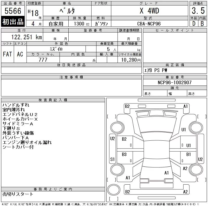 X BUSINESS A PACKAGE | CBA-NCP96 | 2NZ-FE | Full-time 4WD | 4AT | 1298cc | 87ps(64kW)/6000rpm | AИ-92 | 1 438 500 | |