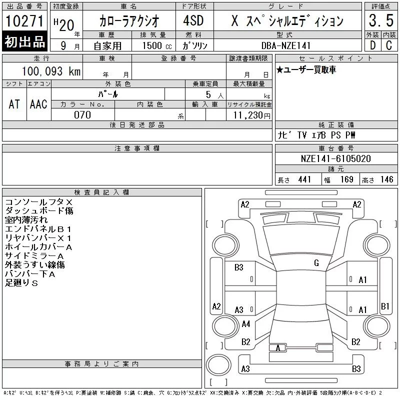 X | DBA-NZE141 | 1NZ-FE | FF | CVT | 1496cc | 110ps(81kW)/6000rpm | AИ-92 | 1 440 000 | |