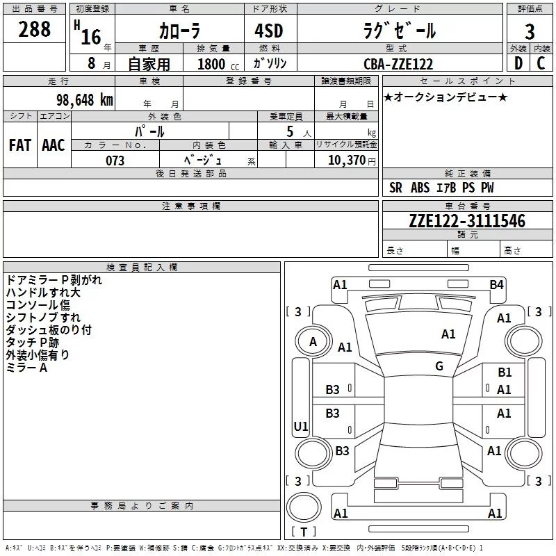 LUXEL PREMIUM EDITION | CBA-ZZE122 | 1ZZ-FE | FF | 4AT | 1794cc | 132ps(97kW)/6000rpm | AИ-92 | 2 005 500 | |