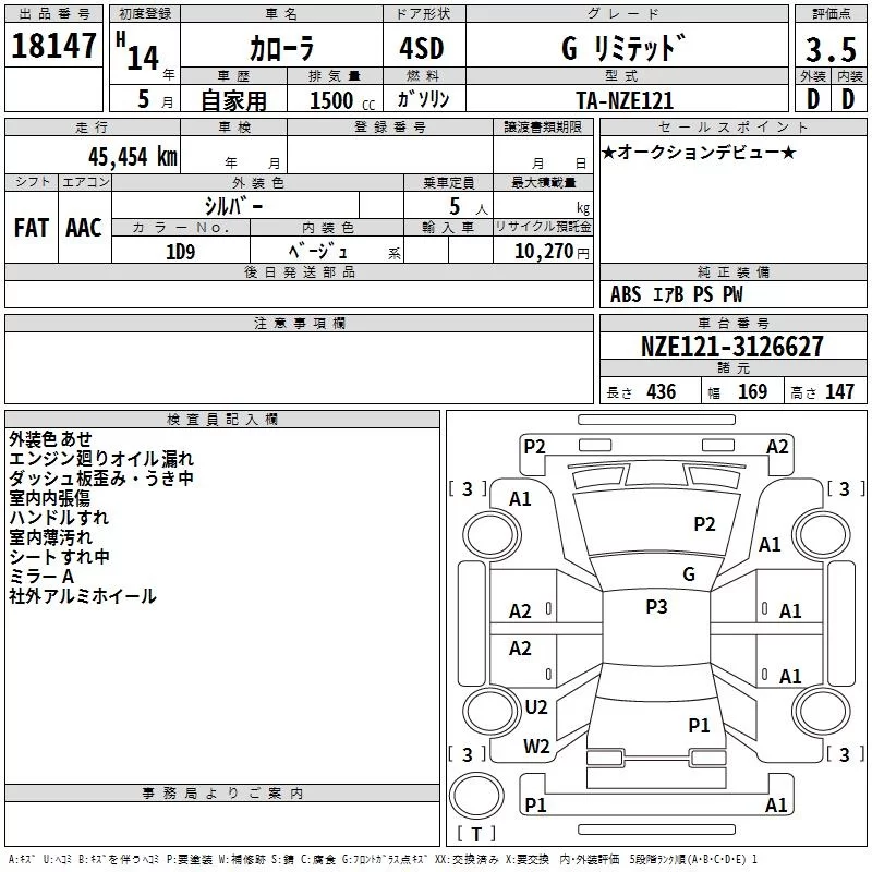 G | UA-NZE121 | 1NZ-FE | FF | 5MT | 1496cc | 109ps(80kW)/6000rpm | AИ-92 | 1 453 000 | |