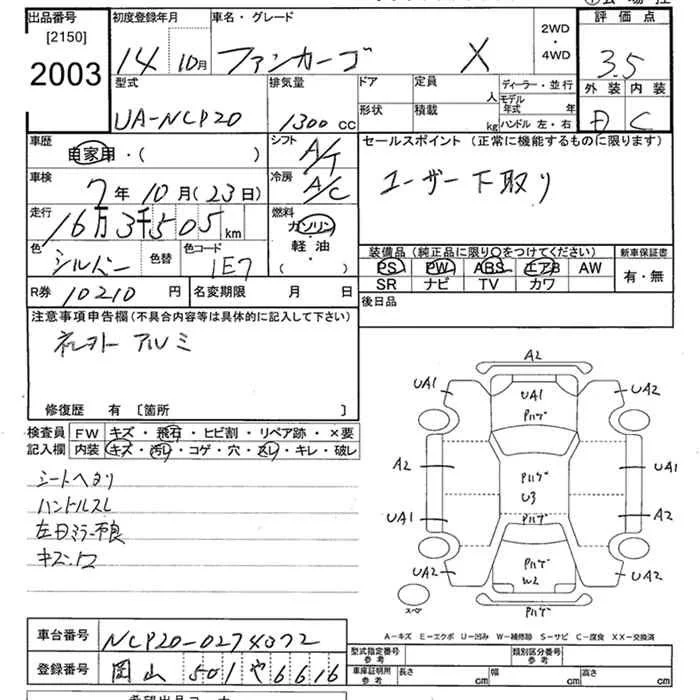 X PAIR BENCH VERSION NAVI SPECIAL | UA-NCP20 | 2NZ-FE | FF | 4AT | 1298cc | 87ps(64kW)/6000rpm | AИ-92 | 1 370 000 | |