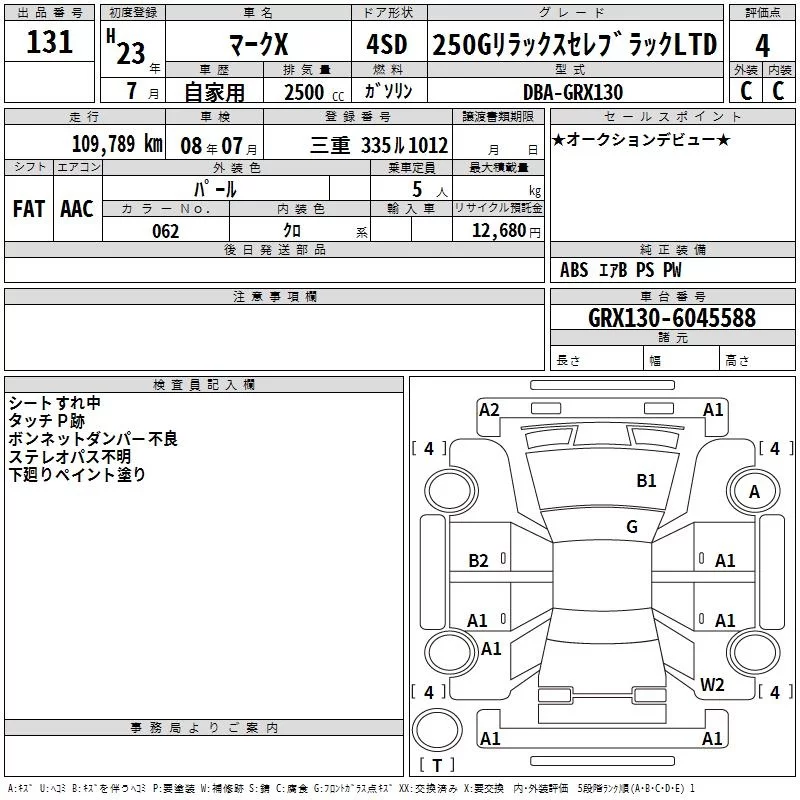 250G RELAX SELECTION BLACK LEATHER LIMITED | DBA-GRX130 | 4GR-FSE | FR | 6AT | 2499cc | 203ps(149kW)/6400rpm | AИ-92 | 2 980 000 |