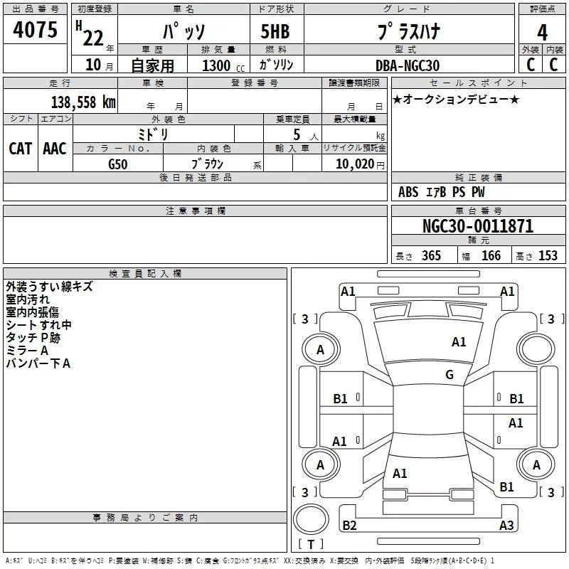 G | DBA-NGC30 | 1NR-FE | FF | CVT | 1329cc | 95ps(70kW)/6000rpm | AИ-92 | 1 325 000 | |