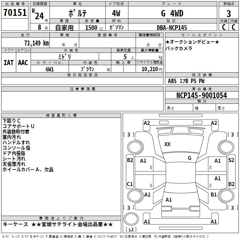 X | DBA-NCP145 | 1NZ-FE | Full-time 4WD | CVT | 1496cc | 103ps(76kW)/6000rpm | AИ-92 | 1 770 000 | |