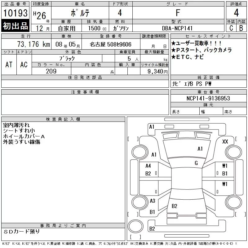 F | DBA-NCP145 | 1NZ-FE | Full-time 4WD | CVT | 1496cc | 103ps(76kW)/6000rpm | AИ-92 | 1 861 715 | |
