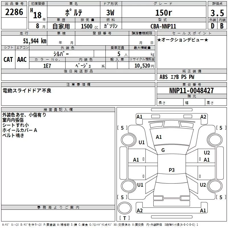 150R MOCHA SELECTION | CBA-NNP11 | 1NZ-FE | FF | 4AT | 1496cc | 109ps(80kW)/6000rpm | AИ-92 | 1 596 000 | |