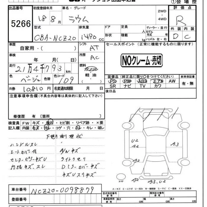 BASEGRADE | CBA-NCZ20 | 1NZ-FE | FF | 4AT | 1496cc | 109ps(80kW)/6000rpm | AИ-92 | 1 596 000 |