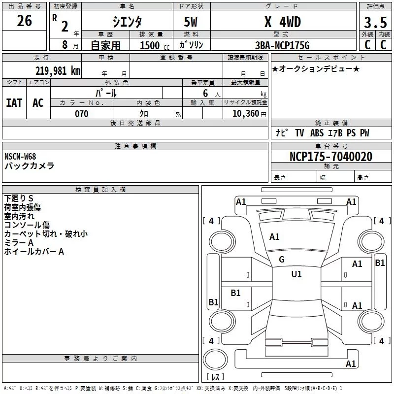 X | 3BA-NCP175G | 1NZ-FE | Full-time 4WD | CVT | 1496cc | 103ps(76kW)/6000rpm | AИ-92 | 1 994 300 | |