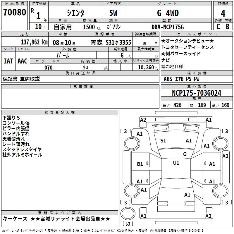 X | DBA-NCP175G | 1NZ-FE | Full-time 4WD | CVT | 1496cc | 103ps(76kW)/6000rpm | AИ-92 | 1 994 300 | |