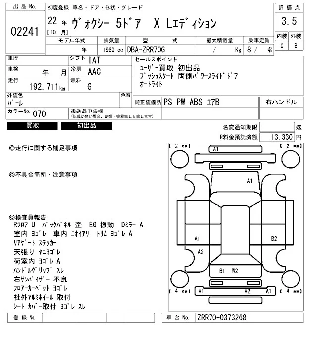 Z | DBA-ZRR70W | 3ZR-FAE | FF | CVT | 1986cc | 158ps(116kW)/6200rpm | AИ-92 | 2 330 000 | |