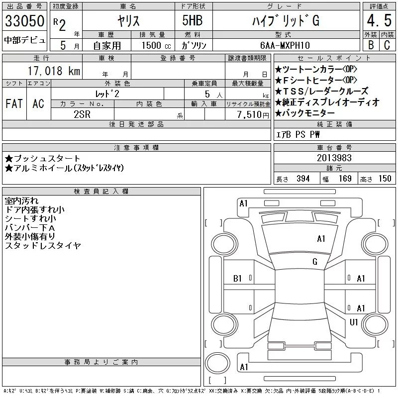 HYBRID G | 6AA-MXPH10 | M15A-FXE | FF | CVT | 1490cc | 91ps(67kW)/5500rpm | AИ-92 | 2 130 000 | |