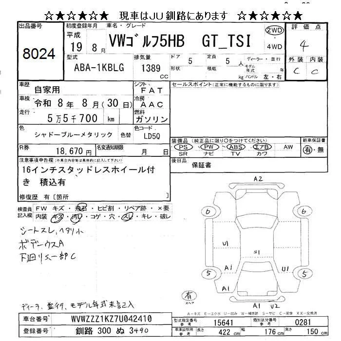 GT TSI | ABA-1KBLG | BLG | FF | 6AT | 1389cc | 170ps(125kW)/6000rpm | AИ-95 | 3 050 000 |