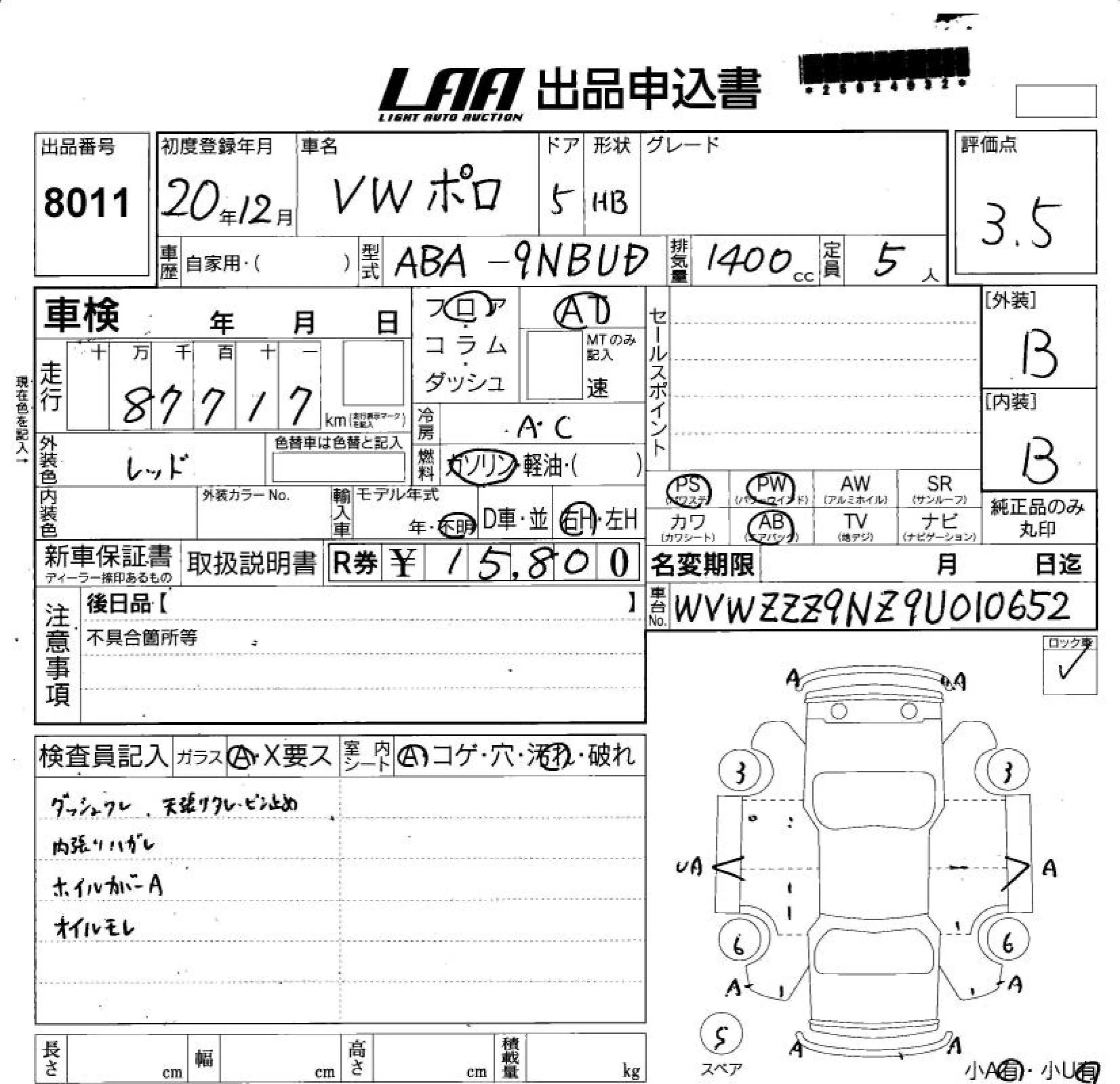 CROSS POLO | ABA-9NBTS | BTS | FF | 6AT | 1597cc | 105ps(77kW)/5600rpm | AИ-95 | 2 420 000 | |